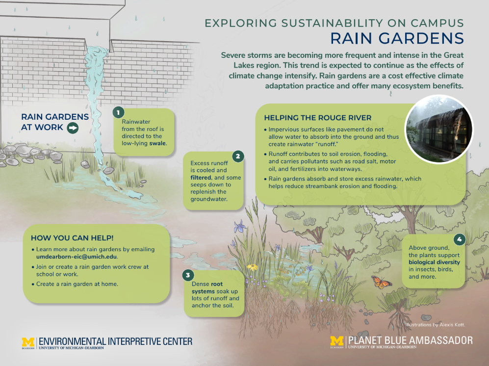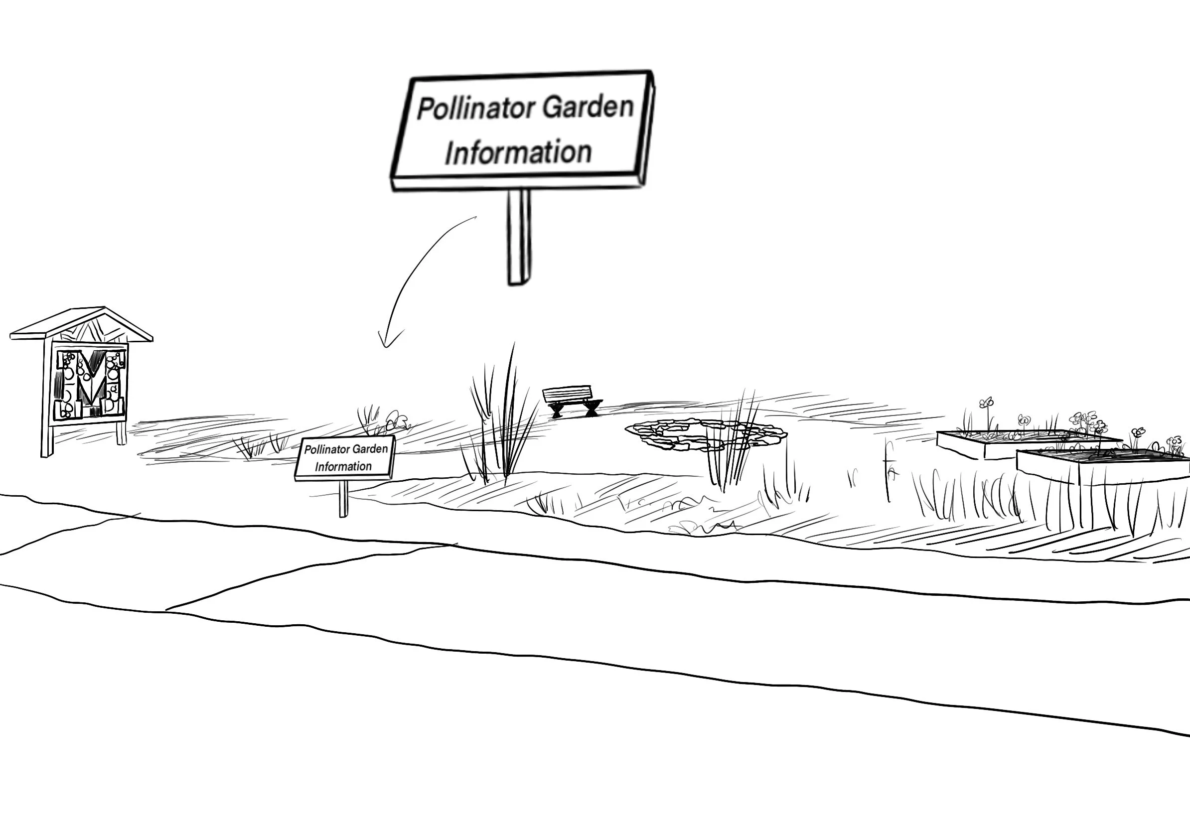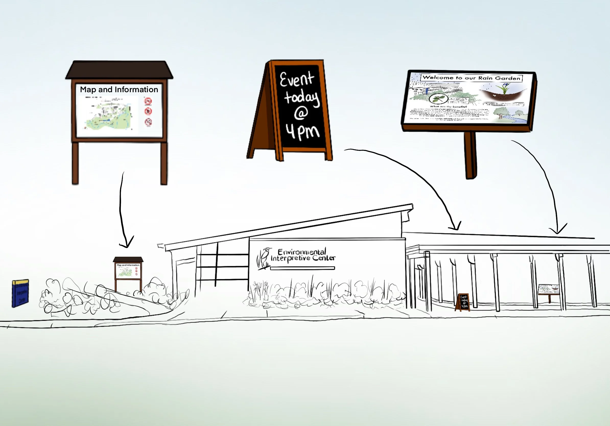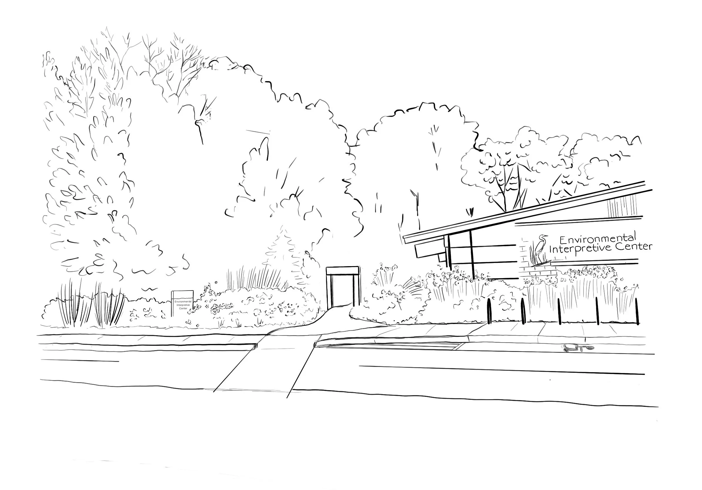 Designs for the Environmental Interpretive Center This displays the range of artwork I completed for the Center, including signage, a logo, promotional materials, and sketches.